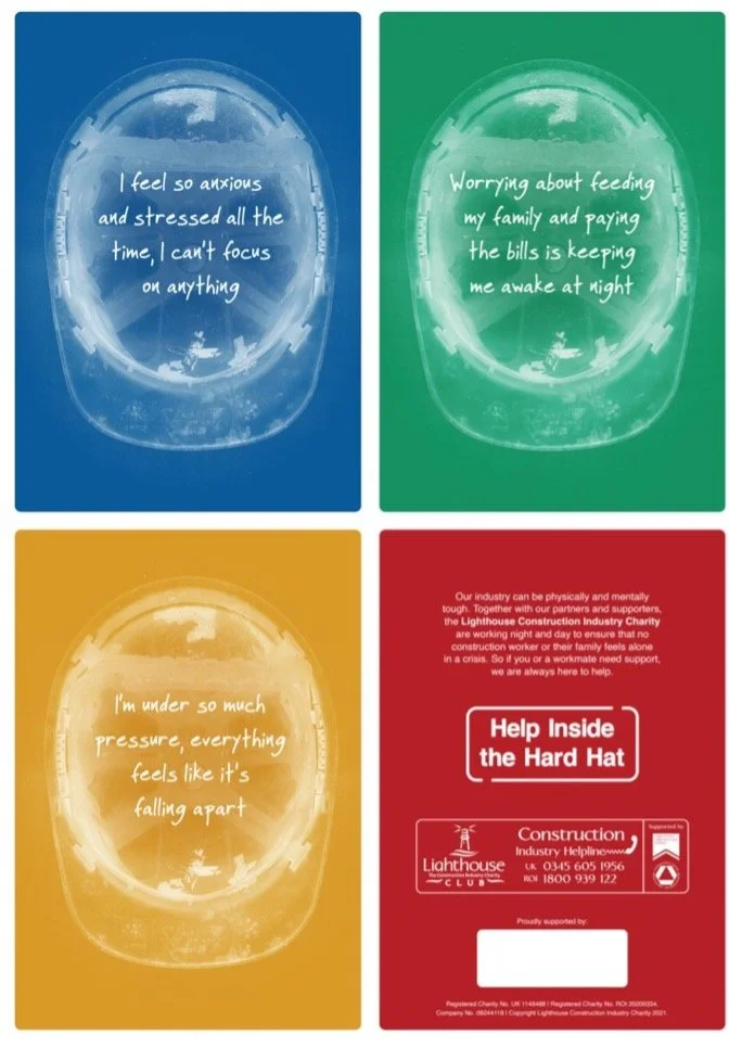 Initiatives for Mental Well-being: In the past 5-10 years, a surge of initiatives has emerged in UK construction and broader business to address mental well-being as part of safety culture. One prominent example is the “Mates in Mind” program (launched in 2017 by the British Safety Council and partners), which provides awareness training, resources, and support networks in construction companies. Many construction firms have introduced mental health first aiders on sites – trained individuals whom workers can approach for initial support, much as one would go to a first aider for a physical injury. The Lighthouse Club, a construction charity, launched the “Help Inside the Hard Hat” campaign in 2021-2023, using posters and on-site events to raise awareness that help is available and it’s okay to talk about mental struggles. This campaign prominently advertises that in the UK, “two construction workers take their life every working day,” urging workers and employers alike to “stop the stigma” and seek support. The campaign’s brightly coloured posters – displayed on site hoardings – list helpline numbers and drive home the message that mental health is as important as physical safety on the job.
